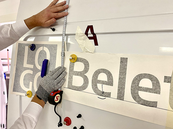 Hoe goed de ontwerper ook heeft meegedacht met de foliemonteur, de praktijk is altijd iets anders. De applicateur moet de werktekening ‘vertalen’ naar een driedimensionale ondergrond. Dit vergt inzicht. Begin niet lukraak met plakken. Maar hang eerst alle onder- delen volgens de werktekening goed uit over de auto. Is de verdeling van de onderdelen in evenwicht? Blijven de teksten goed leesbaar (niet door naden en profielen)? Is alles compleet? Soms blijkt dat er toch wat moet worden afgeweken van de werktekening. Tip: voorzie je afwijkingen ten opzichte van het oorspronkelijke ontwerp? Ga dan eerst overleggen.