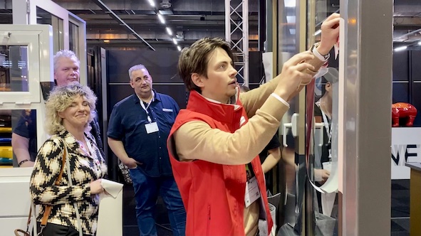 Bij de foto: Max de Haan geeft hier een demo met Facadefilm (kozijnfolie).