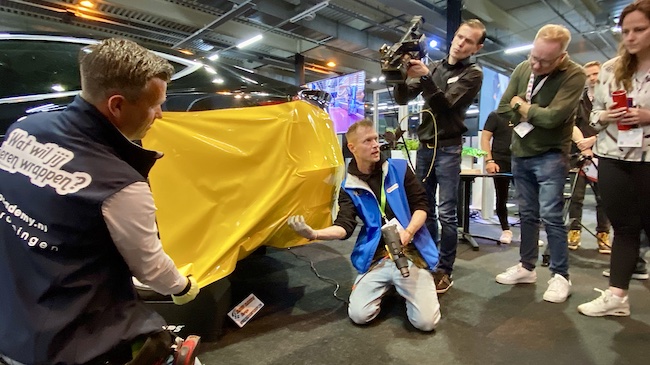 Bij de foto: In anderhalf uur een hele zijkant wrappen, inclusief de spiegel, met al die ogen in je rug. Petje af!