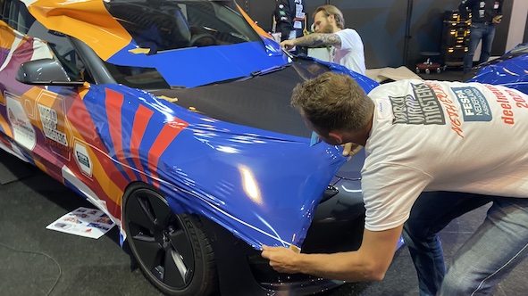 Strak 10.00 startten de eerste rondes met het wrappen van het voorscherm van een Tesla. Daar kregen de deelnemers 15 minuten de tijd voor. Inclusief ontvetten. Niet te doen natuurlijk. Dus petje af voor de deelnemers.