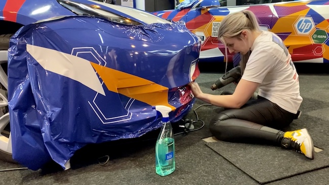 Bij de foto: Twee bumpers wrappen, motorkap en achterklep, en dat in 2 uur. Geen sinecure! Hier Lisa Masselink in actie. Wat een kanjer!