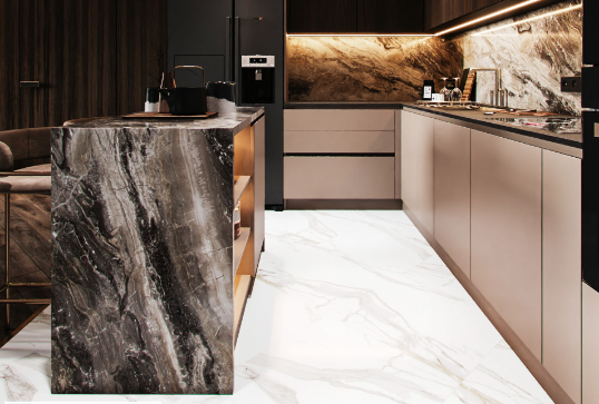 Marmer in de keuken is helemaal ‘hip en happening’. Denk bijvoorbeeld aan een marmeren spatwand of muur gecombineerd met hout en goud. Deze combi geeft een echt luxe uitstraling. Maar ook marmer met zwarte keukenkasten is helemaal “nu”. En uiteraard kan je ook de keukenkasten zelf met marmer wrappen. Interieurfolies met marmerdessins zijn in meerdere kleuren en dessins verkrijgbaar. Van zwart ‘marmer’ met grote witte aders tot creme en wit ‘marmer’ met wat subtielere grijzige aders.