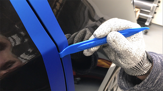 Bij de foto: Ben je gewend te werken met ‘vergevingsgezinde’ carwrapfolies? Het soort folie waar je een achtergebleven bel gewoon wegduwt met je duim? Daag jezelf dan eens uit en perfectioneer je rakeltechniek door te oefenen met een folie met een agressieve lijmlaag. Je zult er veel profijt van hebben tijdens het wrappen.