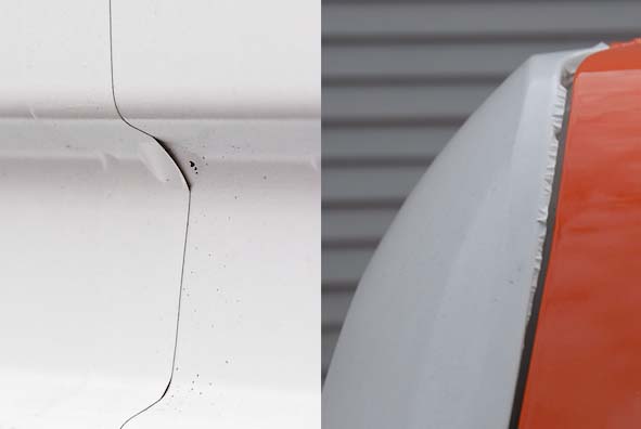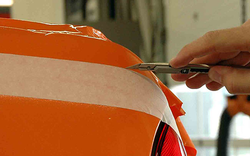 In de praktijk komt het regelmatig voor dat voor grote vlak- ken ook een snijfolie wordt ingezet. Simpelweg omdat het logo groot geplaatst moet worden, of de exacte kleur niet beschikbaar is in carwrapfolie. Het aanbrengen van grote vlakken snijfolie is echt een pittige uitdaging en vergt behoorlijke vaardigheid van de foliemonteur. Snijfolies hebben namelijk een hoge aanvangshechting en niet de prettige wrapeigenschappen die carwrapfolies hebben. Als je snijfolie toepast als carwrapfolie neem je bovendien een kwaliteitsrisico. Veel snijfolies zijn technisch niet geschikt om uit te rekken en bijvoorbeeld door profielen te monteren. Het risico op folieonthechting is groot.