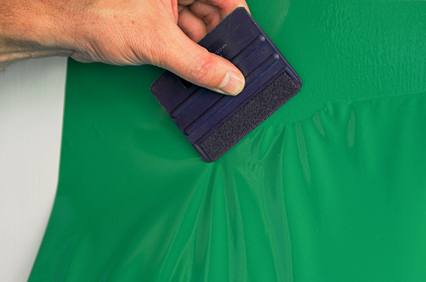 Met een efficiënte rakeltechniek zorg je dat ieder stukje van de folie wordt geraakt. Dit is belangrijk, want daar waar je de folie niet hebt aangedrukt, blijft lucht achter tussen de folie en de ondergrond. Risico: lelijke luchtbellen en onthechting.